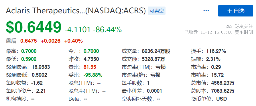 接连失败的Aclaris Therapeutics。自免药物公司Aclaris Therapeutics在2023年3月宣布ATI-450治疗化脓性汗腺炎2a期临床试验失败,接着在同年11月宣布被寄予厚望的ATI-450治疗类风湿性关节炎的2b期临床研究宣告失败,股价当日暴跌86%。