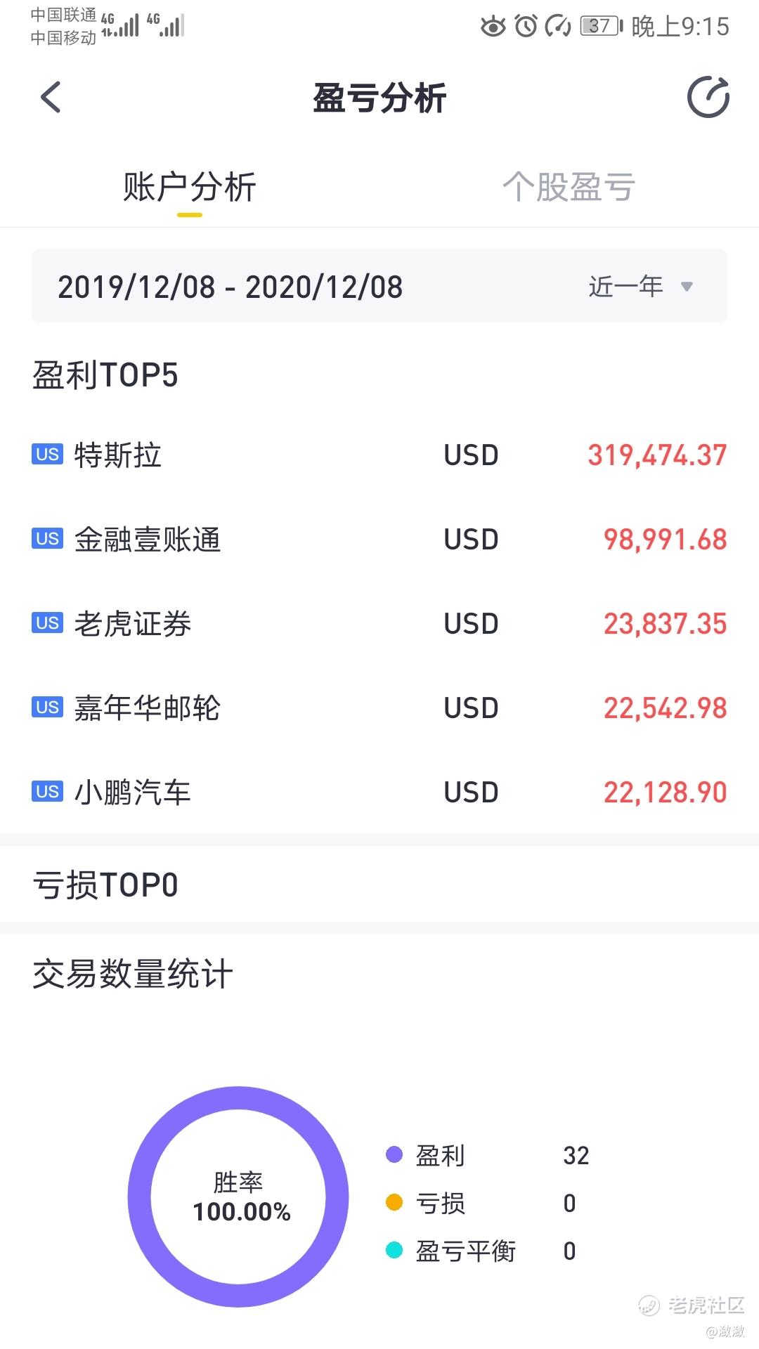 今年投资的主线是新能源革命,电动车特斯拉、理想、小鹏,激光雷达威力登;其次是疫情相关股:吉利德、默沙东、SRNE,邮轮、达美航空、美油ETF、BILI......陆续投资了今年以来总共买过三十几只股票,包括老虎证券,到年底盘点竟然全部赢利。做的最难的老虎证券从6元开始一直买到4.6,最后也大幅赢利卖出。帐户从7万开始,不经意间超过了80。