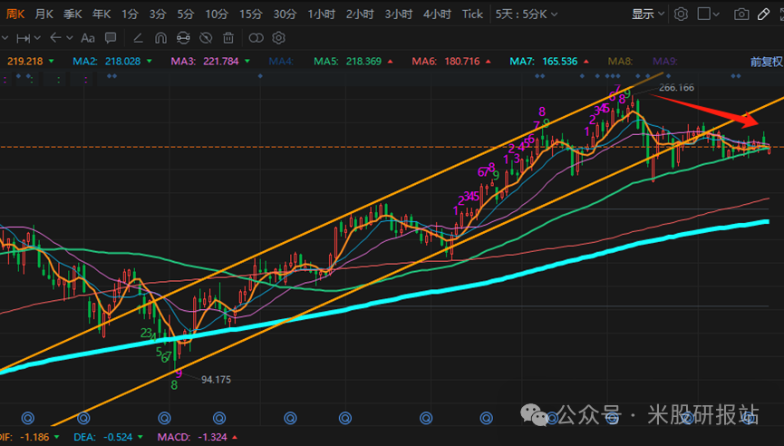 (1)估值压力仍存:SOXX当前的市盈率为33.44,远高于半导体行业合理区间(25-30倍)。在现有估值水平下,SOXL的投资风险显著,尤其是在波动性较高的市场环境中,杠杆效应可能导致更大的损耗效应。(2)技术面疲软:SOXX目前形成头肩顶形态,200美元的关键支撑若失守,可能进一步跌至180美元区域,直接影响SOXL的表现。短期内建议投资者暂时观望,避免因市场调整导致更大的损失。