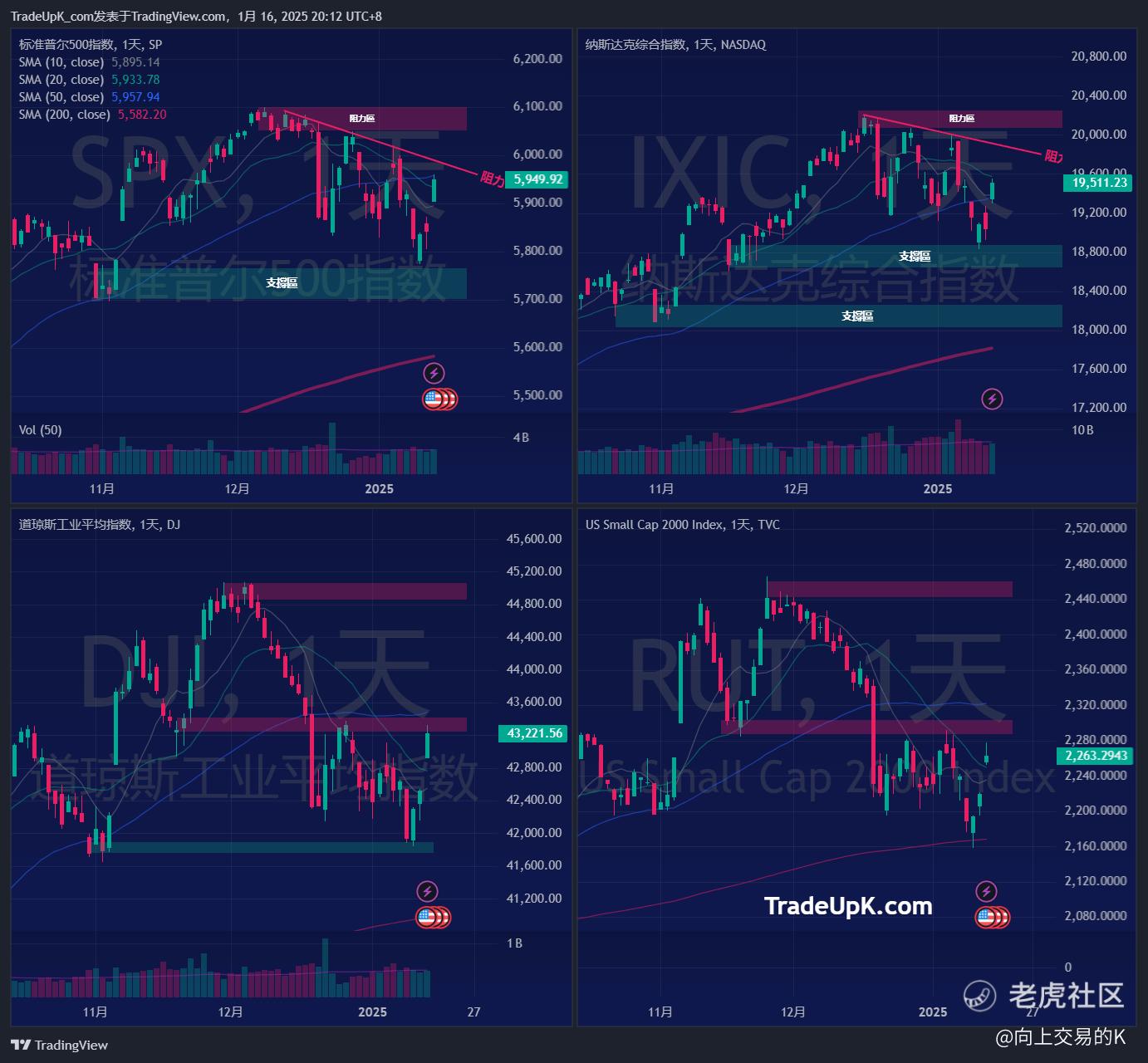 回顾1月11日K的大盘分析,分析正确。之前已经说了会存在反弹的可能性。标普、纳指、道指都是到支撑区反弹,罗素到200MA反弹。虽然有反弹,还是保持我们的看法: