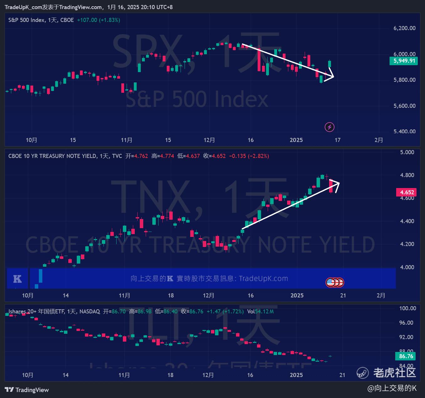 当前市场的情绪倾向于担忧美国通胀可能难以控制,因此下周 DT 的上台,他的政策方向,以及 CPI 的走势将成为今年需要关注的重点。此外,中美贸易战的持续升温也是市场的潜在担忧之一。不过,我们不需要过度揣测,市场中大资金的行为会直接反映在图表上,我们只需跟随这些资金的走向交易即可。我会在发现重要交易点或机会时及时分享,免费提供参考。