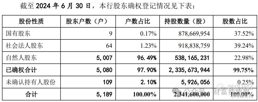 据最新招股说明书显示,截止2024年6月底,东莞银行已确权股东中,共有股东5080户,其中自然人股东就有5007户,合计持股约5.38亿股,占总股本的22.98%;社会法人股东64户,共持有9.19亿股股份,占总股本的39.24%;国有股东9户,共持有8.79亿股股份,占总股本的37.52%。前十大股东中仅有第一大股东东莞市财政局(21.16%)持股比例超过5%,由于股权较为分散,东莞银行无控股股东及实际控制人。