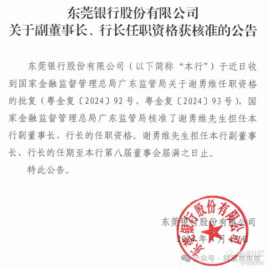 至此,东莞银行新任董事长、行长“靴子”落地。