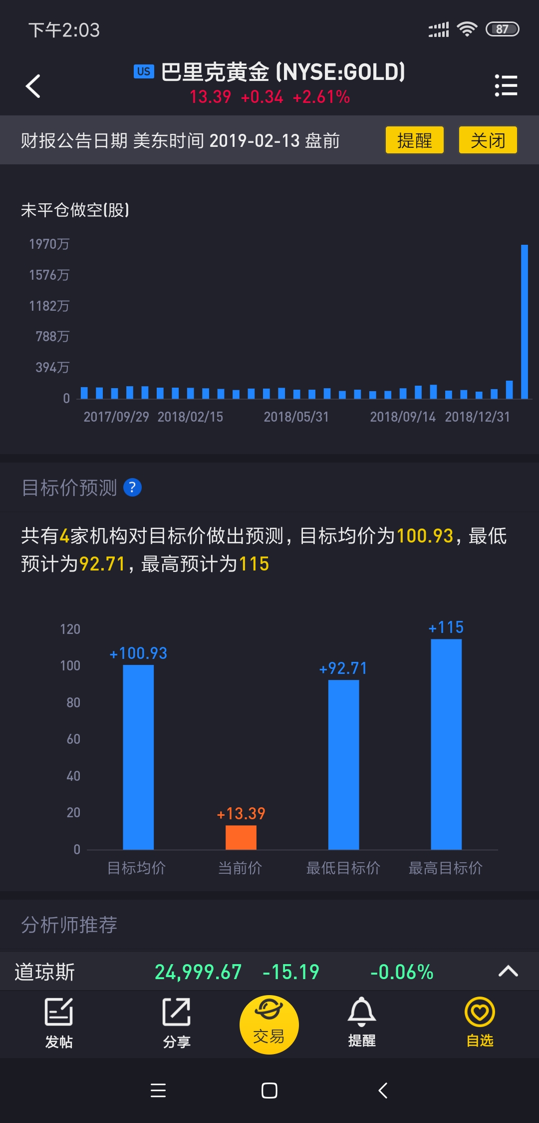$巴里克黄金(GOLD)$ 分析师目标价100美元?还有巴里克黄金的市值150亿美元的,现在只有12亿美元,数据都是些什么乱七八糟的。