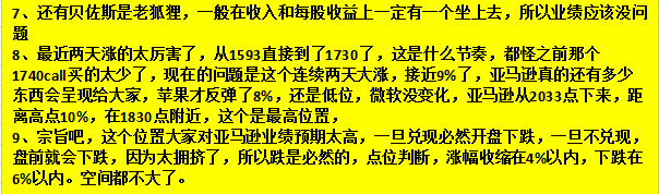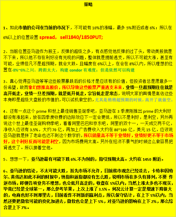 在amzn 中我前三天就在组合成本18的位置建仓,因为股价随着苹果利好、ALIBABA财报靓丽和鲍威尔鲍叔的鸽派不加息而连长三天,在周四晚点时候我的组合价值已经吓到12,亏损较大,我当时的决策是,重新在16附近建立三个组合,然后把之前的仓位平掉。而这个平仓最后证明是一个非常愚蠢的决定,因为当时我平掉就感觉不对了,因为我估算了我的仓位,即使amzn价格涨到1790点我的仓位也不会继续亏了,我能承受到1790的价位,而我估计他就不会达到这个价位,即使是在1720附近收盘,他也就是4%的空间,最高摸到1790,1800需要巨大的利好的,而amzn显然没有这么多利好的,股价已经反弹了快10%了,数据不会超级好,盈利已经达到极限了,无从触发。所以最可能在1780之下震荡。即使超越了,那么我保留一个原来仓位也可以,至少可以从12涨到20 ,盈利1000.不好的是当时已经还有2分钟收盘了,没时间下单了,盘后只能是股票交易了。其实最后1小时从1747调到1717的时候我就感觉市场已经转向了,非常类似于今年夏天的fecebook的走势了,财报前其他公司的利好推动大涨,创新高,最后1小时下滑,公布财报后直接大跌20%。当然AMZN不会 那么惨。这也从侧面说明,我们倒时差,身体还是不那么自然。amzn的上限是从多个角度数据分析的结果。