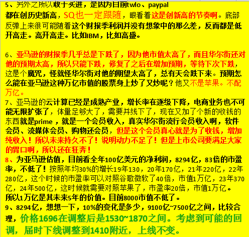 后续看法,亚马逊已经走下破路了,非常像2018年2月的腾讯,英雄气短了,亚马逊的盈利大家老有幻想,想当然的以为它可以提高利润率,你以为他是苹果呢啊??