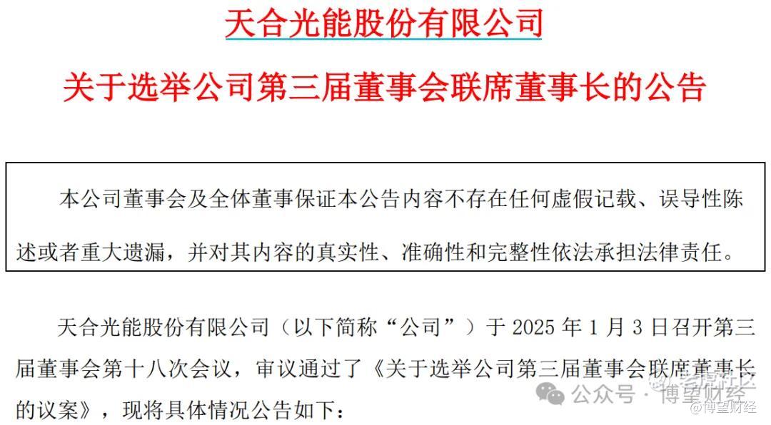 1月3日,天合光能公告称,为进一步完善公司治理结构,促进董事会各项工作的规范化开展,公司董事会增设联席董事长1人,全体董事一致同意选举高海纯为公司第三届董事会联席董事长。
