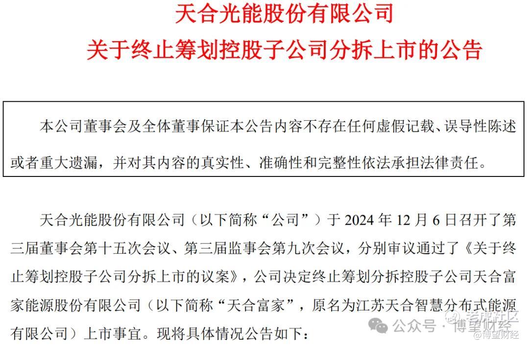 但时隔一年半之久,天合光能于2024年12月发布关于终止筹划控股子公司分拆上市的公告,提及终止原因,公司将从传统的光伏产品制造商转型升级为光伏及储能智慧能源整体解决方案提供商,其中天合富家的分布式系统业务和运维业务是最贴近终端并为客户提供全生命周期服务的板块,该板块将成为公司解决方案发展战略的重要组成部分。显然,这个理由有些学牵强。