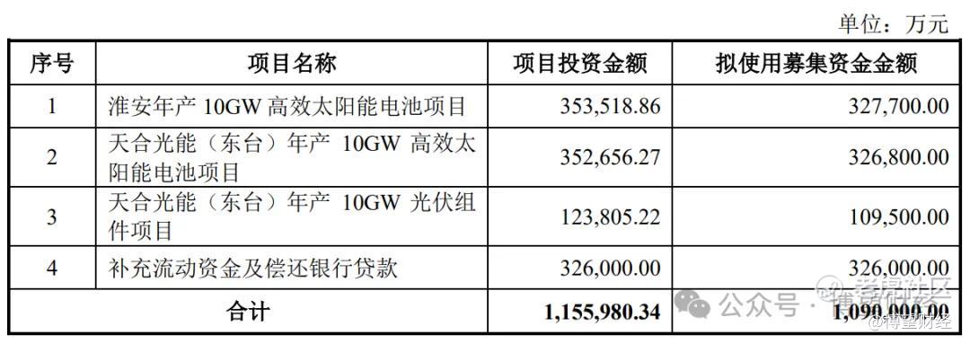 2023年7月,天合光能发布公告称,计划在2023年度向特定对象发行A股股票,募集资金总额不超过109亿元,其中76.4亿元用于投建淮安年产10GW高效太阳能电池项目、天合光能(东台)年产10GW高效太阳能电池项目、天合光能(东台)年产10GW光伏组件项目,剩余资金用于补充流动资金及偿还银行贷款。