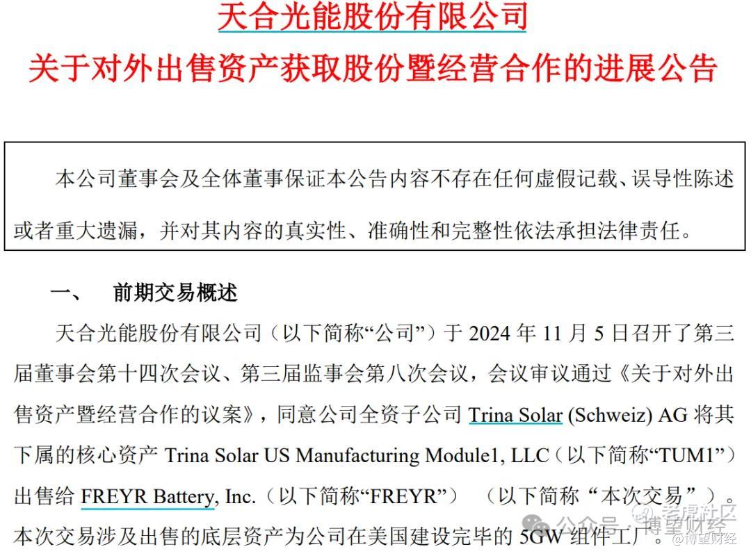 天合光能也开始出售资产。2024年12月,天合光能发布《关于对外出售资产获取股份暨经营合作的进展公告》,将其在美国建设完毕的 5GW 组件工厂出售,目前已收到支付的1亿美元现金,并获得面值1.5亿美元的优先票据及1544万股普通股,同时收回了作为原上层股东对TUM1的0.5亿美元借款。