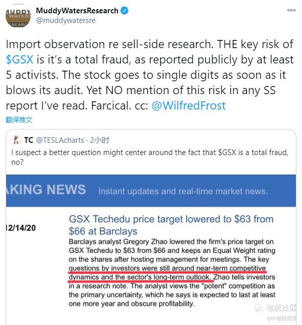 上述言论是浑水对巴克莱银行此前发布的一份研报作出的评论,后者在研报中称:“在与跟谁学的管理层会面后,巴克莱银行的分析师Gregory Zhao将该公司股票的目标价从66美元下调至63美元,并将其股票评级维持在‘持股观望’不变。这位分析师在一份研究报告中向投资者表示,投资者担心的主要问题仍然与其近期竞争形势以及这个行业板块的长期前景有关。该分析师认为,‘强大的’竞争是这只股票所面临的首要不确定性。他表示,预计这种不确定性至少还将持续一年,并冲淡其盈利能力。”