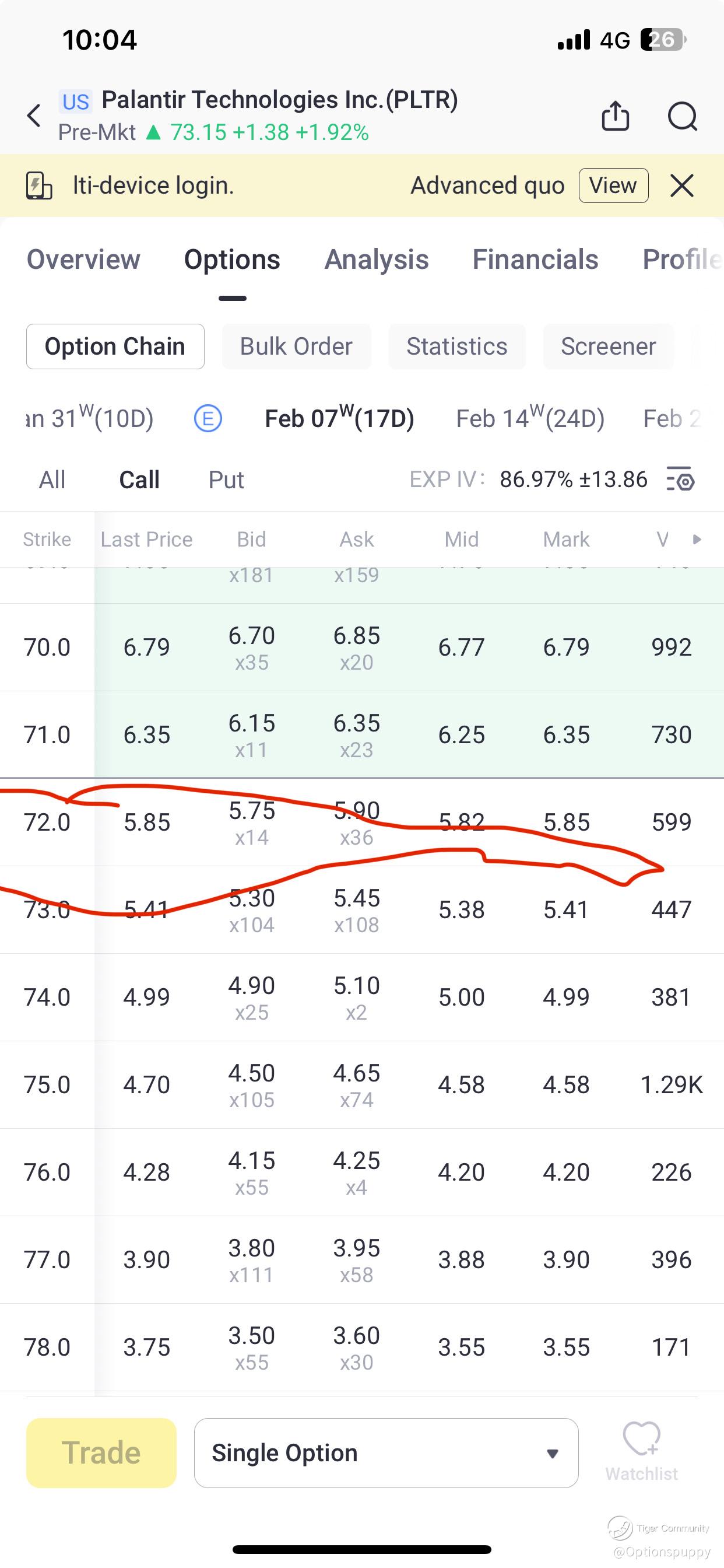 I might sell a call at 72 taking $6 which works out to be $5/66 or around 8% of premium for 17 days if I trust that pltr earnings will be good .