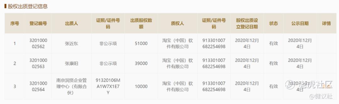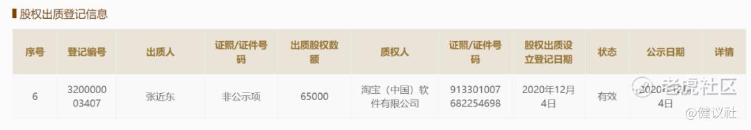 此外,张近东还将6.5万股苏宁置业集团股权出质给淘宝(中国)软件有限公司,股权出质登记日期也是今年12月4日。