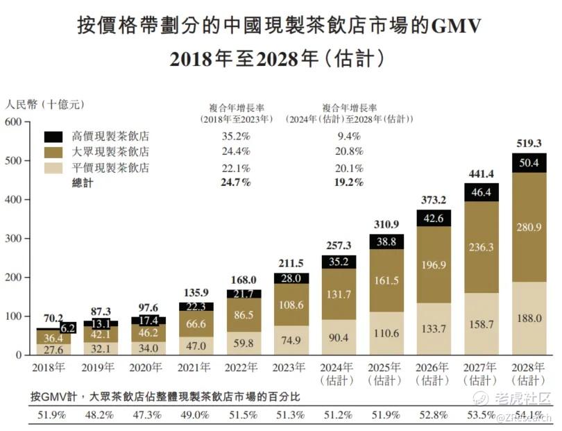 通常来说,中国现制茶饮店分为产品平均售价不低于人民币20元的高价现制茶饮店、产品平均售价为人民币20元以下且在人民币10元以上的大众现制茶饮店及产品平均售价不高于人民币10元的平价现制茶饮店。按2023年GMV计,大众现制茶饮店市场是中国现制茶饮店市场中规模最大的细分市场,按2024年至2028年GMV预期增长率计,其是增长最快的细分市场。与平价品牌相比,大众现制茶饮店品牌一般使用新鲜水果及鲜奶等优质原料制作饮品,从而满足消费者对优质饮品不断增长的需求。与高价品牌相比,大众现制茶饮店品牌因以更加亲民的价格提供高质量饮品的能力,更适合消费者日常饮用。根据灼识咨询报告,中国大众现制茶饮店市场的GMV由2018年的人民币364亿元增长至2023年的人民币1,086亿元,复合年增长率为24.4%,预计至2028年将进一步增长至人民币2,809亿元,2024年至2028年的复合年增长率为20.8%。该细分市场**国现制茶饮店市场2023年GMV总额的51.3%,预计2028年市场份额将增长至54.1%。