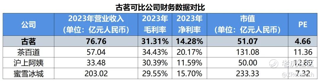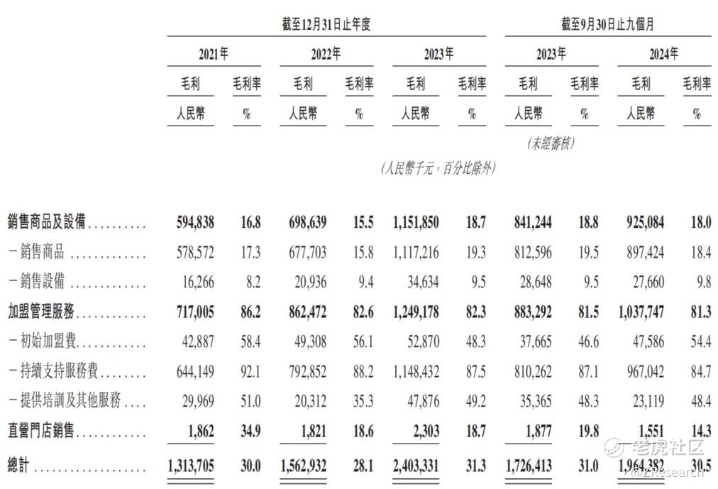 2021年、2022年、2023年及2024年前三个季度,古茗的毛利率分别为29.97%、28.11%、31.31%、30.50%。其中,加盟管理服务的毛利率较高,超过80%。