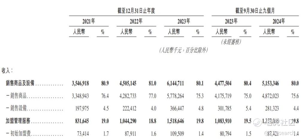 招股书显示,2021年、2022年、2023年及2024年前三个季度,古茗的营业收入分别为43.84亿、55.59亿、76.76亿和64.41亿元,2022年、2023年及2024年上半年同比增长率分别为26.81%、38.07%、15.62%。营业收入增长主要原因在于门店数量的增加和现有门店销售额的提高。古茗的收入主要来自向加盟商销售货品及设备以及提供加盟管理服务,2024年前三季度占总收入的比重为99.8%。