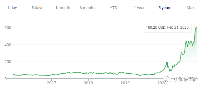 从2016年到2019年的几年间,特斯拉的股价一直维持在40~70美元之间上浮动。从去年Q3开始,特斯拉迎来第一波较大的涨幅,并于今年2月21日达到180美元。此后一路下跌至3月18日的72美元;紧接着特斯拉的股价便开启第二轮涨幅,直接蹿到450美元,这个价格从八月到11月一直相对稳定;然后从11月13日开始,特斯拉开启第三波涨幅,目前为599美元: