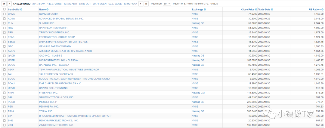 我们先看一下特斯拉的基本面:2019年,特斯拉凭借367,820台的销量获得了新能源汽车冠军,占据世界新能源汽车市场18%的份额。总营收为246亿美元,毛利率为23.5%,全年净亏损8.6亿美元。截止今天,特斯拉市值为5600亿美元,市盈率超过1000。这个市盈率水平,能在美股5000家公司中,排进前30。
