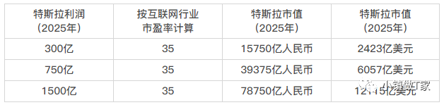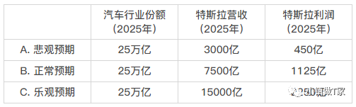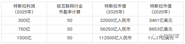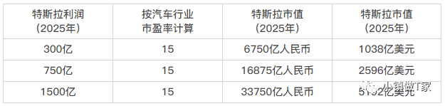 得出特斯拉2025年市值在1038亿~5192亿美元之间,均低于特斯拉目前的市值。
