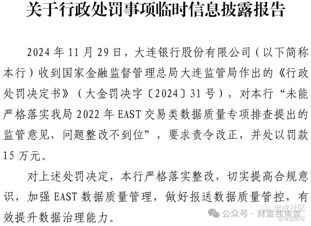 据官网显示,2024年11月,大连银行收到国家金融监督管理总局大连监管局作出的《行政处罚决定书》(大金罚决字〔2024〕31号),因未能严格落实我局2022年EAST交易类数据质量专项排查提出的监管意见,问题整改不到位,被要求责令改正,并处以罚款15万元。