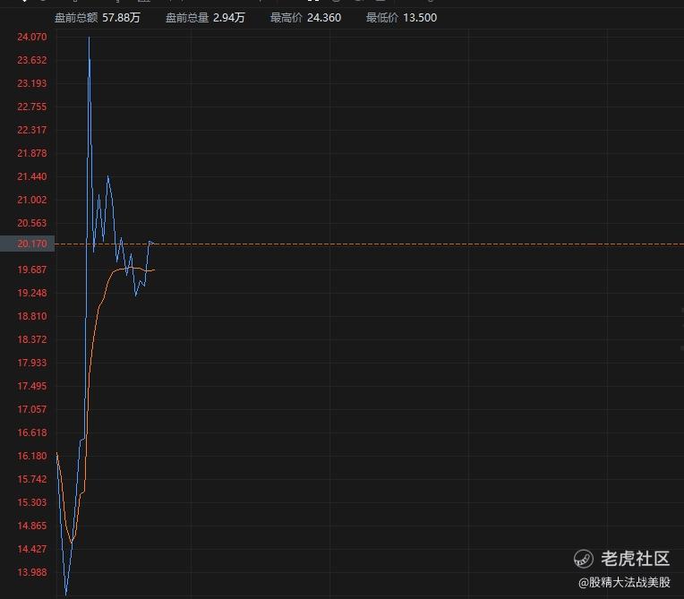 就在大脑决策的时候,经典的一幕出现了:这支股出现了最近盘前股没有的盛况,在短短的一分多钟内,从低点13多一路飙升到24,并且一度盘前涨幅超过了200%!