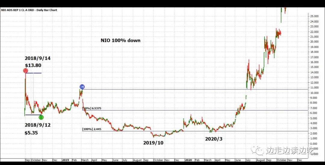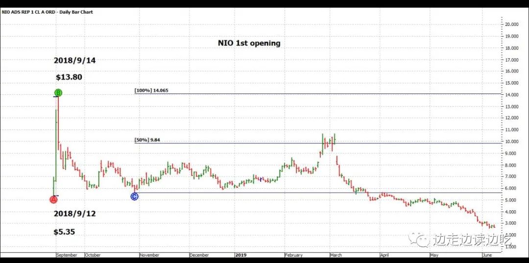 蔚来在2018年9月12日上市,红了三天,然后一路下跌,略微反弹后,无法突破第一浪的50%压力线,继续下跌,2019年10月2日跌到最低点$1.19。