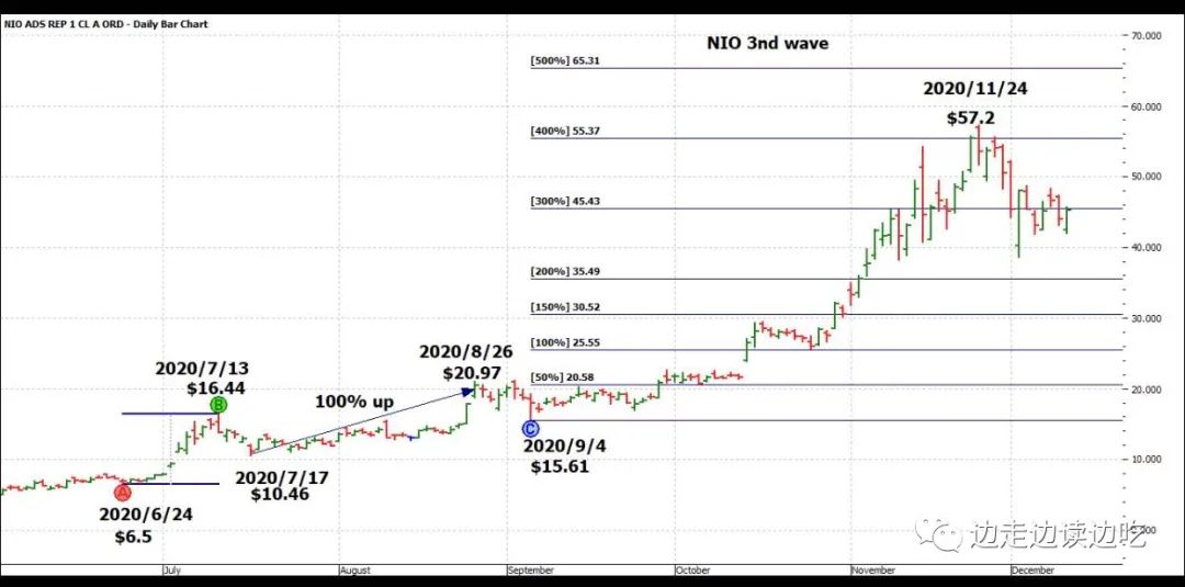 上图所见:第一浪红点至绿点,第二浪始于2020年7月17日,触100%阻力位下跌(见下图),第三浪始于2020年9月4日,一气呵成直奔400%阻力位才下跌。(到达400%阻力位下跌是铁律)。