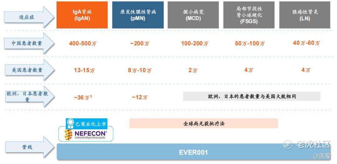 肾病是云顶新耀核心竞争力最强的领域,不仅有已经商业化的耐赋康®,还包括拥有全球权益的处于临床中的新一代共价可逆BTK抑制剂EVER001。耐赋康®聚焦患者基数最大的IgA肾病适应症,而EVER001则有望用于更广泛的肾病领域,填补包括原发性膜性肾病(pMN)、微小病变(MCD)、局部节段性肾小球硬化(FSGS)在内的全球性临床空白。