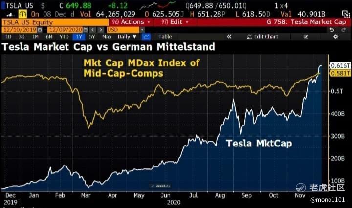 現在德國中型股指數MDax中的德國中小型企業股票的市值比汽車製造商特斯拉還低。特斯拉的Mkt上限已增至6160億美元,而60 MDax的mkt上限總額為5810億美元。