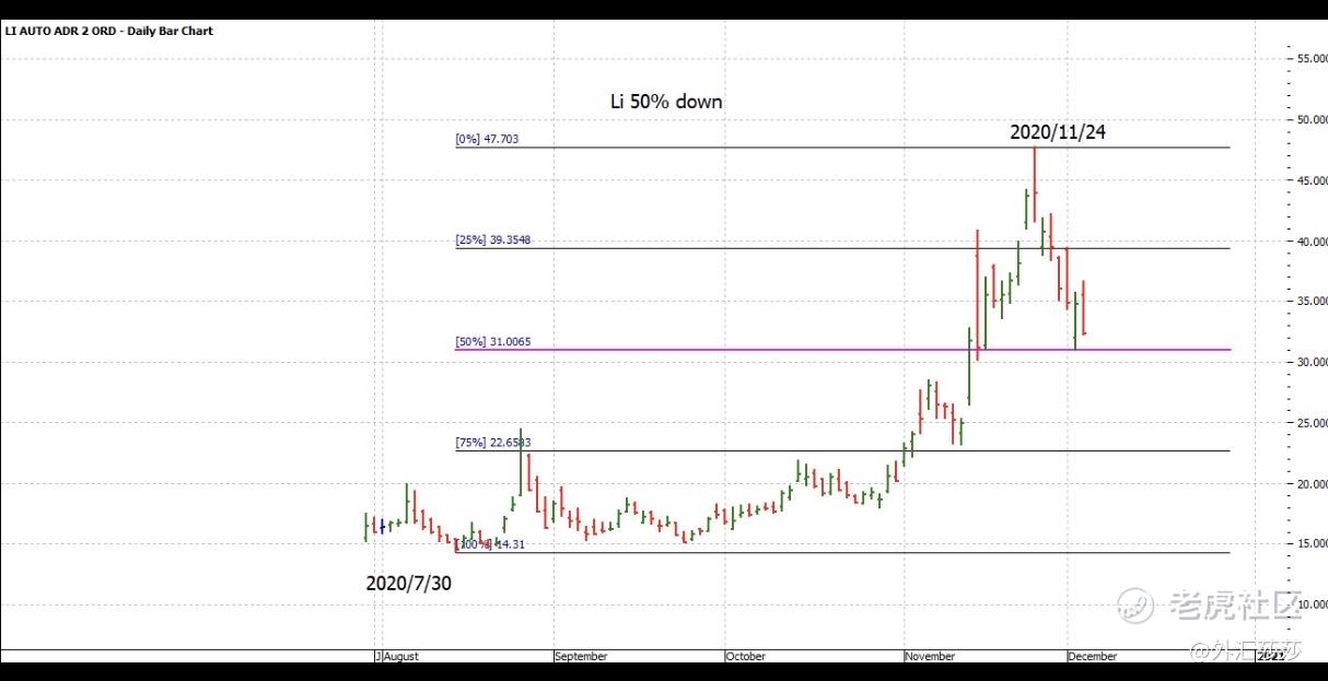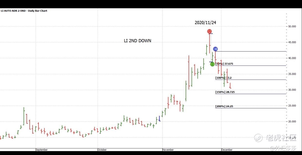 2020年12月5日: $理想汽车(LI)$理想昨夜跳空低开,已经跌破前期升幅的50%支撑位,有望跌到$24.25。