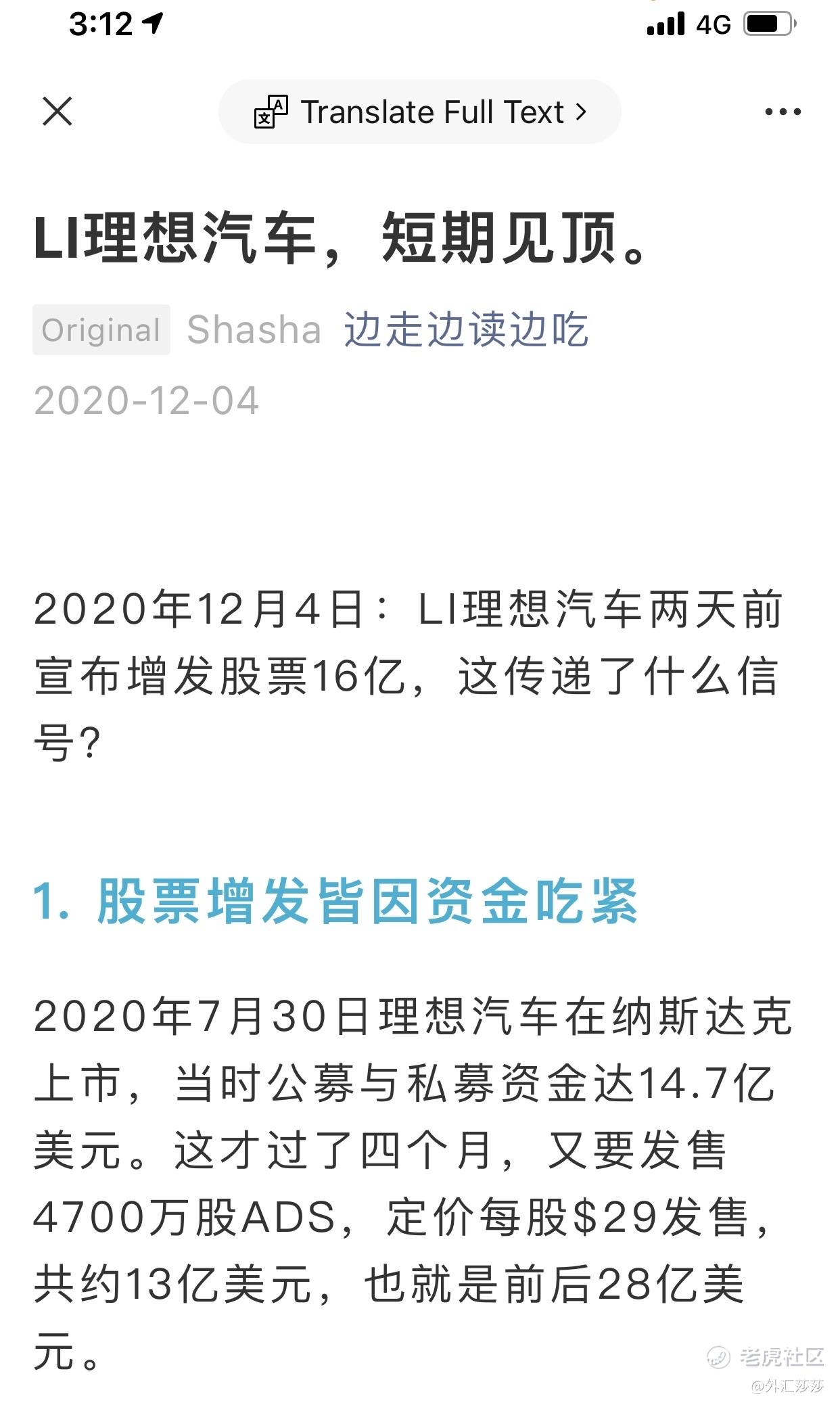 2020年12月4日:LI理想汽车两天前宣布增发股票16亿,这传递了什么信号?