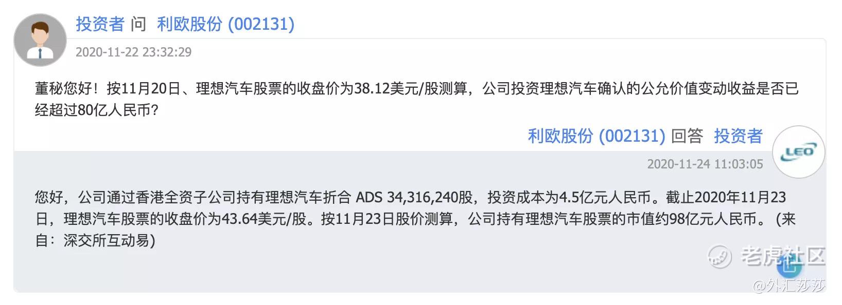 利欧股份(002131.SZ)在互动平台表示,公司通过自己的香港子公司对理想汽车投资4.5亿元,截至11月23日,4个月时间,投资理想汽车确认的公允价值变动收益达约93.5亿元人民币。并且,这部分股票预计明年1月底解除限售。