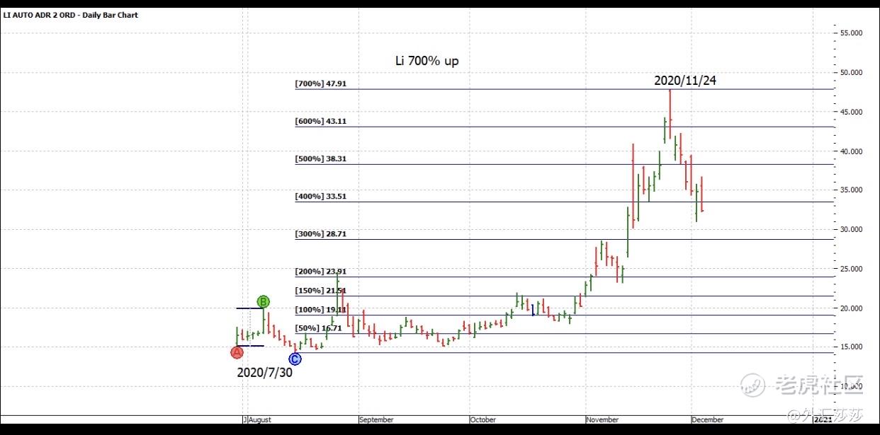 从下图看,理想股价已经达到了第一浪升幅的700%。而第一浪的作用是非常有效的,因为你可以看到,股价在触碰到第一浪的100%、150%、200%、300%这些阻力位时,都非常敏感,或者遇阻下跌,或者回调时以之前的阻力位为支撑位。最后,11月24日,股价在700%阻力位$47.91前止步。
