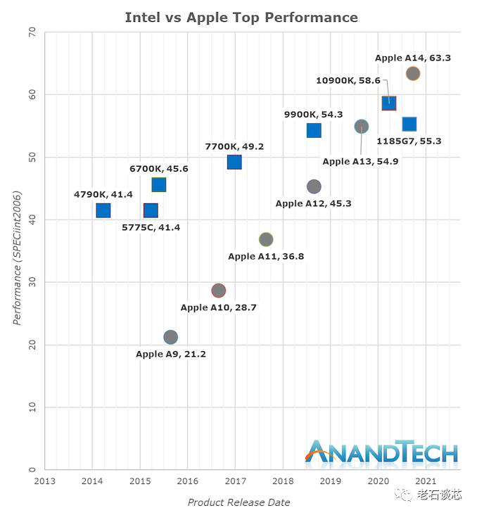 从Anandtech的这张图里就能看到,在过去的5年里,英特尔芯片的单线程性能提升了28%,而苹果则提升了将近3倍。所以,苹果采用自研的Apple Silicon芯片,也是必然的选择。