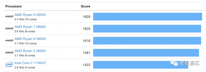 事实上,它们的单核跑分都超过了AMD刚刚发布的锐龙9 5950X,也超过了英特尔的TigerLake旗舰版,也就是11代酷睿的i7-1165G7。
