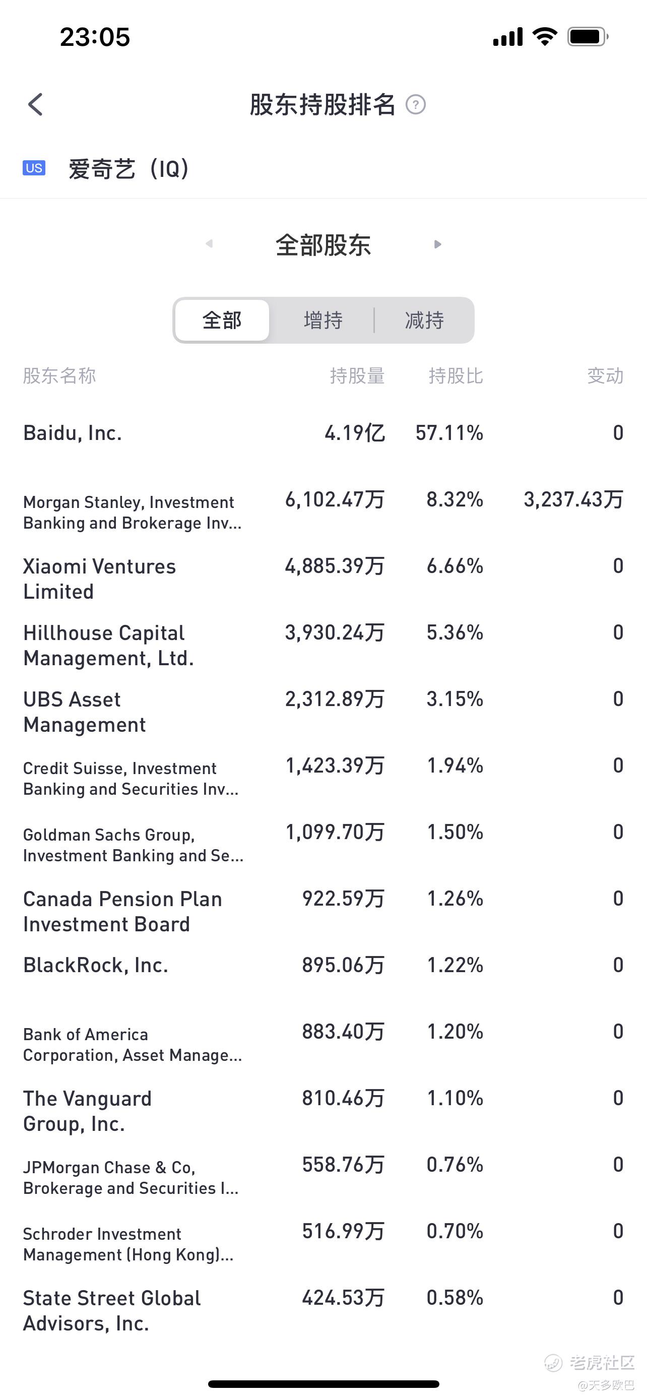 9.1-12.1之间大摩增持了3237万股,这期间股价是21-28,就算他22均价增持(实际肯定高于),也就是7亿刀,按19的价格算,浮亏1亿刀,大摩是傻子吗?我买了40万刀iqiyi,与大摩一起站岗,等大摩为我解套赚钱。