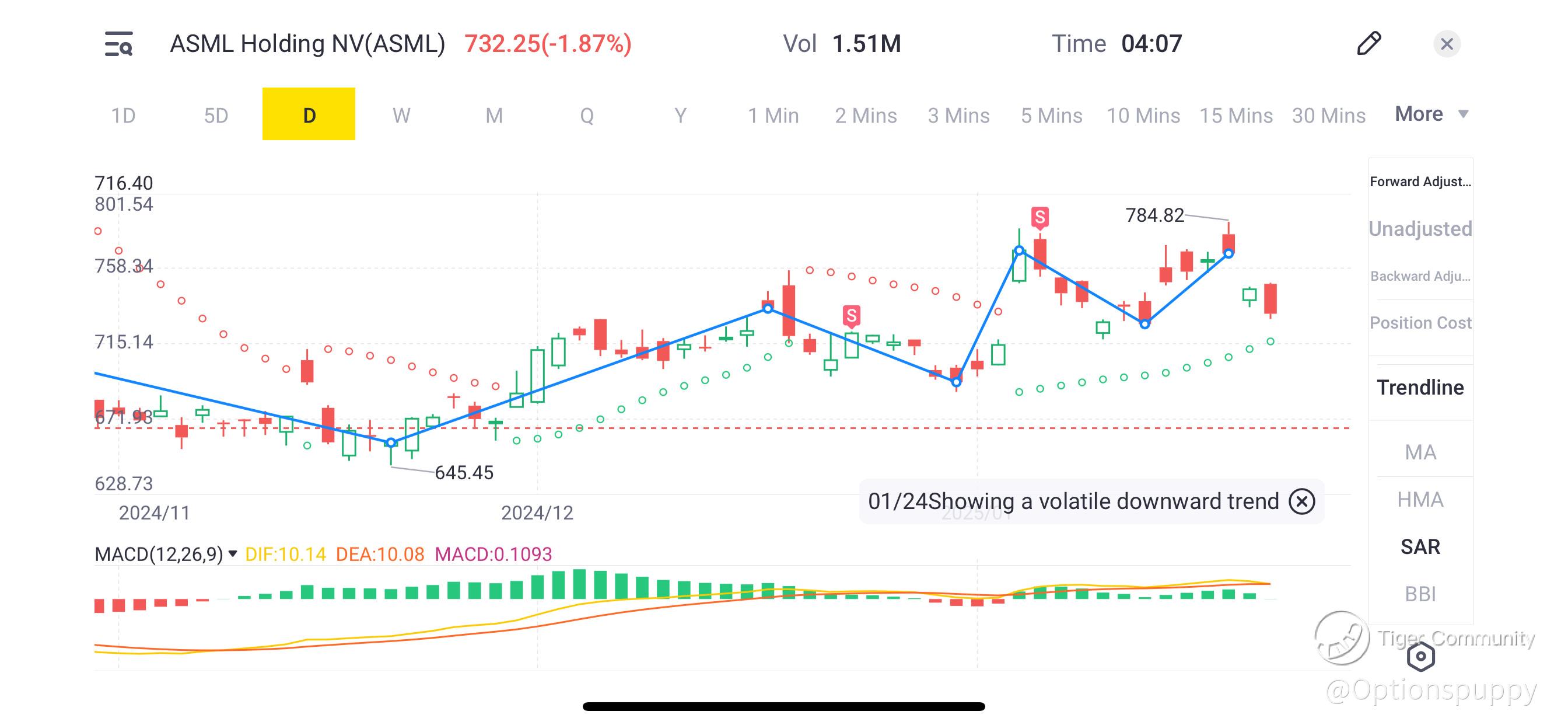 - For ASML, the MACD line is currently at 10.14, with the signal line at 10.08, resulting in a MACD histogram value of 0.1093. This slight positive momentum suggests that while there may be some upward pressure, it is not strong enough to counteract the overall bearish trend indicated by the SAR.