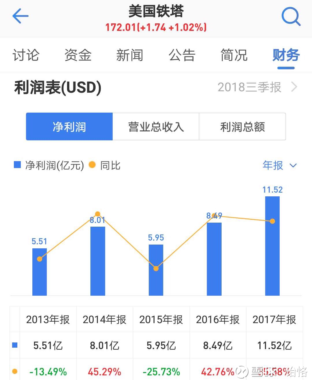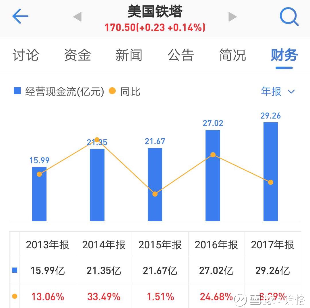 $中国铁塔(00788)$ 美国铁塔净利润过去五年累计39.48亿,而经营现金流累计115.29亿。经营现金流是净利润的2.92倍。也就是盈利现金流量比率为2.92倍。中国铁塔2017年净利润19.43亿,经营现金流349.35亿,盈利现金流量比率高达18倍。该比率远大于1,表明企业会计利润的收现能力很强,利润质量很高。主要原因应该是固定资产实际使用寿命50年,但20年折旧完。因此目前经营现金流远高于净利润。等折旧完,美国铁塔净利润就高速增长。中国铁塔也以后也类似此情形。所以这是长线股权投资基金看好美国铁塔、中国铁塔的原因所在。