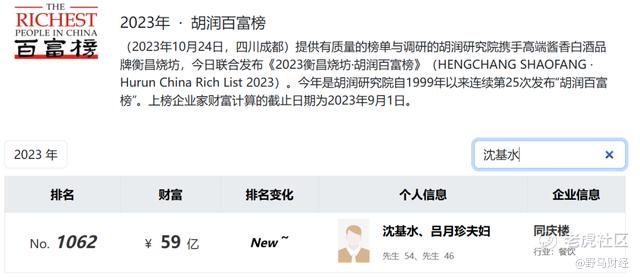 2023年,同庆楼股价曾达到40.45元/股的历史峰值,沈基水、吕月珍夫妇也在2023年10月,以59亿元的财富估值位列《2023年·胡润百富榜》第1062位。