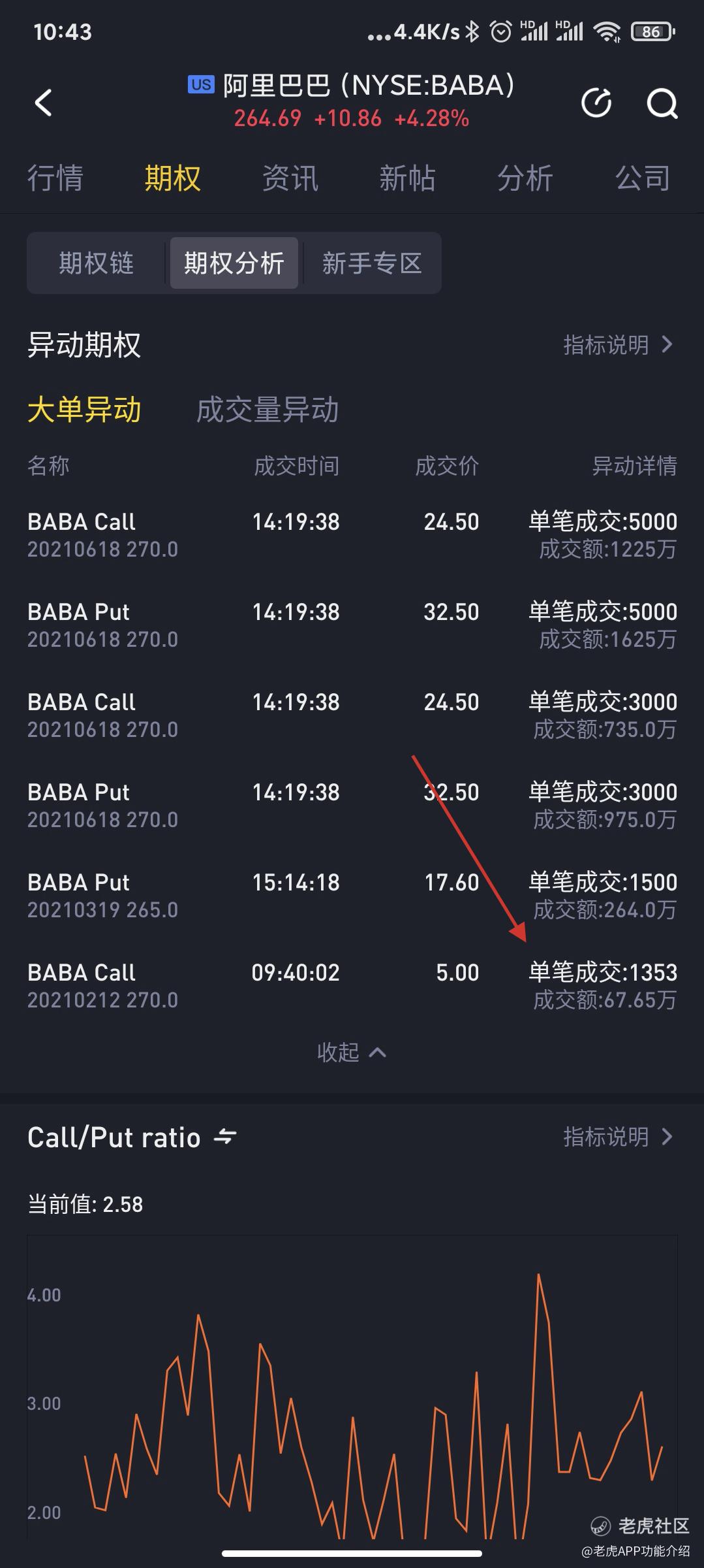 我们先来说说大单异动,看下图的阿里巴巴大单异动,2月12日270的CALL,单笔成交了1353股,成交了67.35万元,且由于这是一笔价外期权,所以这很有可能是有人在下注阿里在未来几天内能大幅上涨。