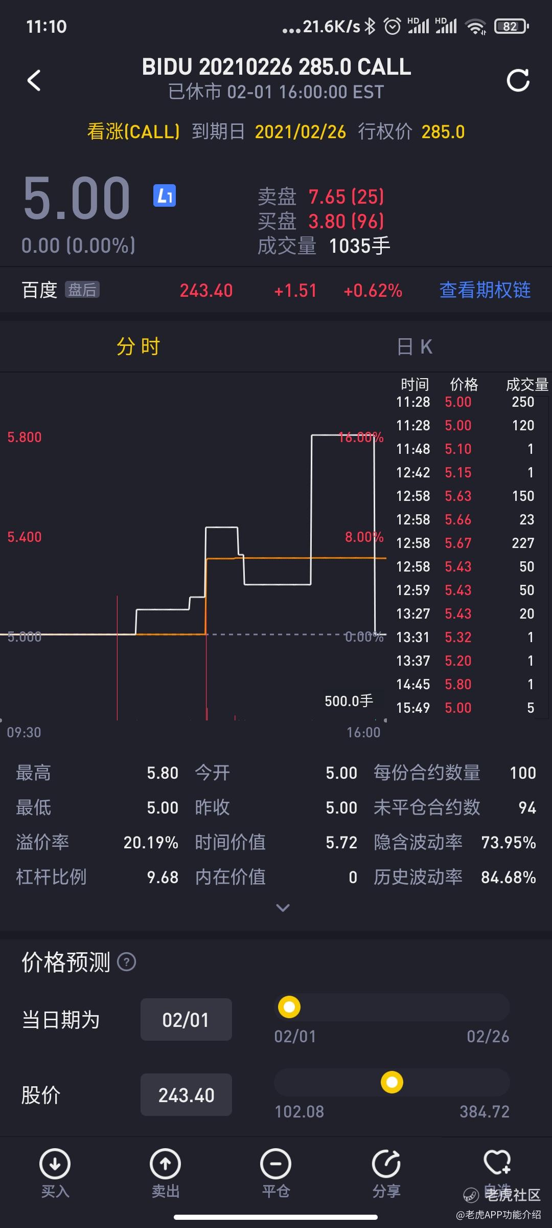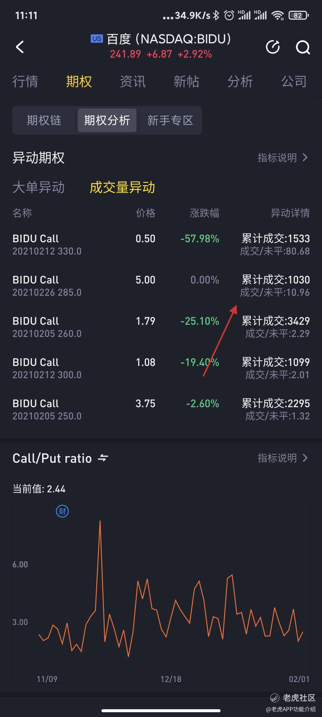 然后再来说说成交量异动,比如我们来看百度的这笔期权,2月26日到期,285的call。在11点和13点左右出现了两次密集成交,且期权价格出现了抬升,针对于这种流动性较低的期权,这种密集成交有较大概率是有人在大量买进。而总计接近1000手,超过50万美金。这是一笔异动期权,且由于拆单成交,并不易被发现。现在但是我们依旧可以给你扫描出来喔[爱你]。另外,百度在2月25可是会发财报的呢,285这个价外财报后的期权,虎友们自己考虑好喔?
