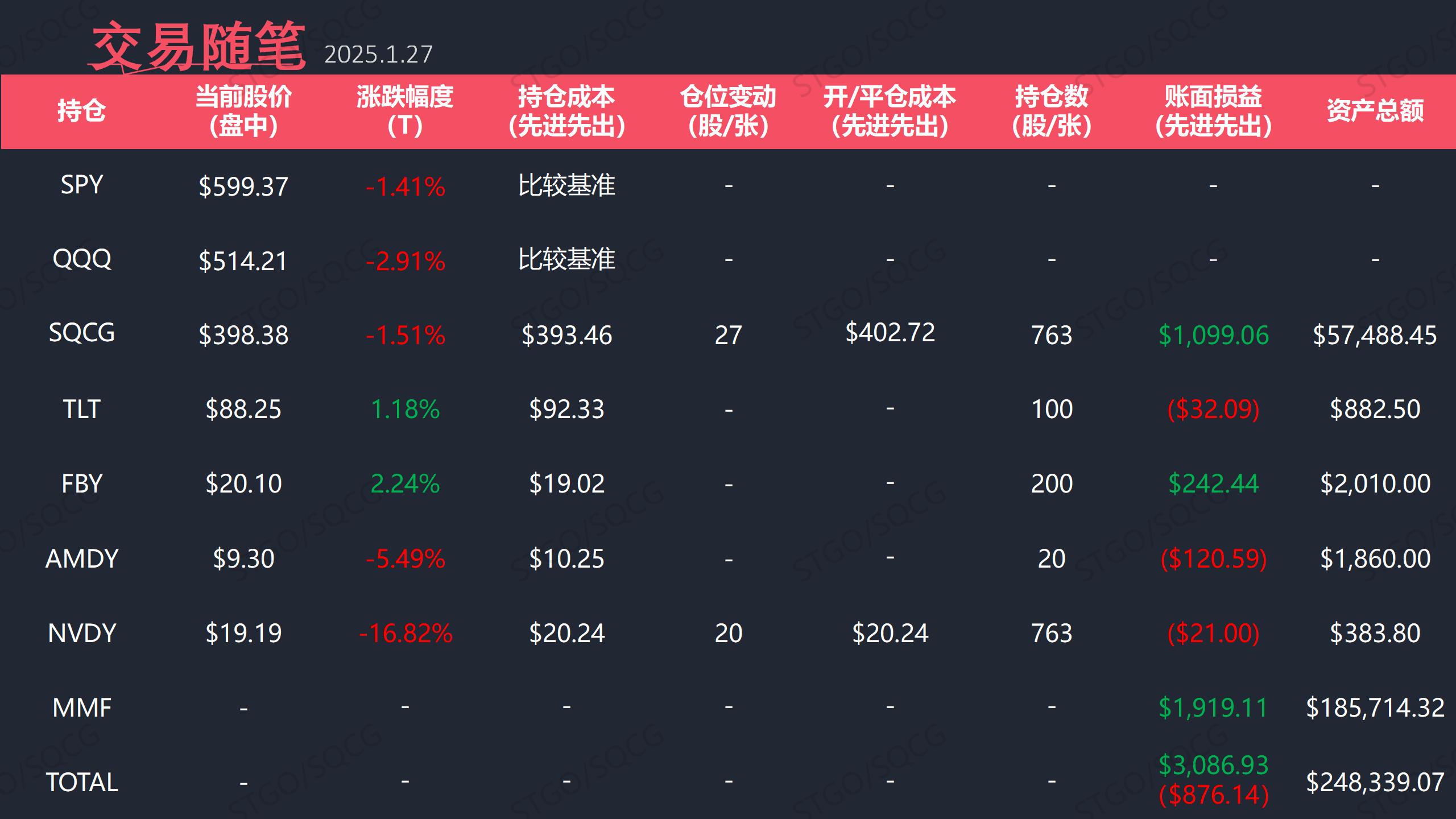 3、事实上,我们昨天也算是见证了历史。NVDA单日的市值蒸发规模达到5890亿美元,为美国股市历史上最大,这打破了之前的纪录。去年9月初,英伟达单日重挫超9%,市值单日蒸发2790亿美元,当时也创下了美国股市历史上最大的单日市值蒸发规模。这样的数据看似恐怖,但是其实对于我们这样的指数投资者来说,昨天的下跌仅仅是1.51%的亏损,而且SQCG中4个标的中还有一个是上涨的。