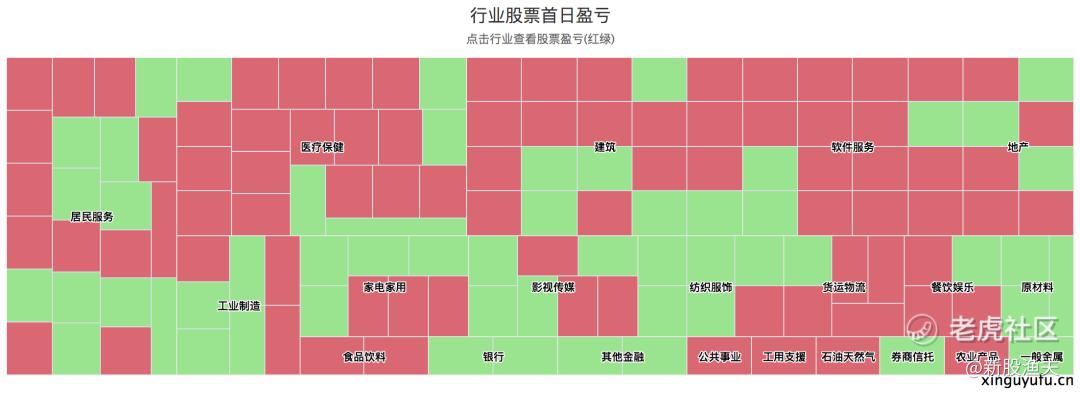 下图展示行业首日盈亏,点击具体行业可以看出该分类下涨跌股票,红色收涨,绿色收跌。