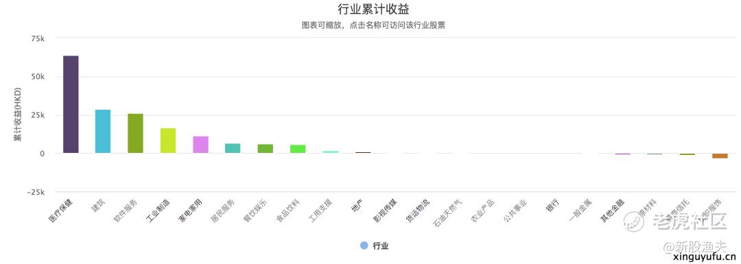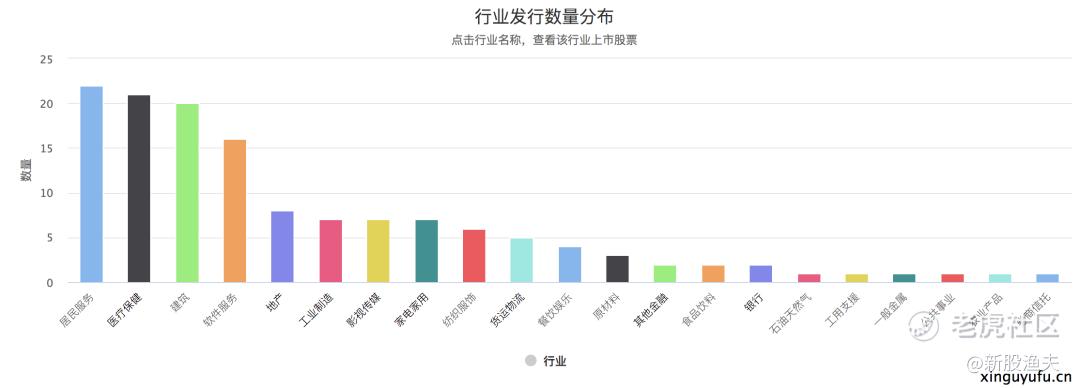 上市股票共涉及21 种行业,前三甲$医疗保健$ (23支),$居民服务$ (22支),$建筑$ (20支), 下图为上市股票行业分布图,点击行业名称,可以查看该行业下所有股票详情、涨跌幅等信息。