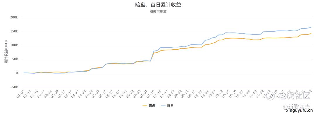 假设每只新股都打并且中签一手,于暗盘收盘卖出或首日收盘卖出,每月累计收益曲线。