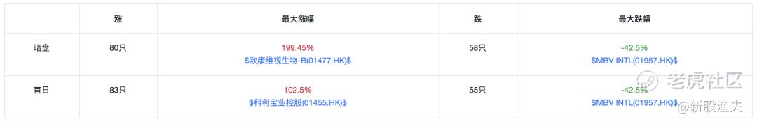 下表为暗盘或首日涨跌数、最大涨幅、最大跌幅对比。