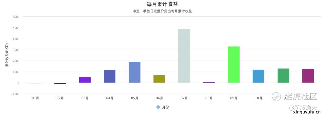 假设每只新股都打并且中签一手,首日收盘卖出,每月收益情况。7月是最赚钱的月份,9月也不错。