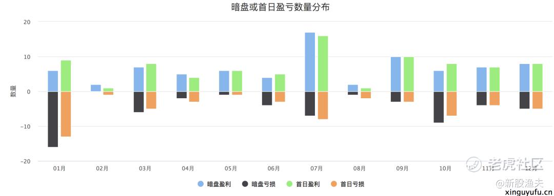 下图以月为维度,展示暗盘或首日盈亏数量分布。