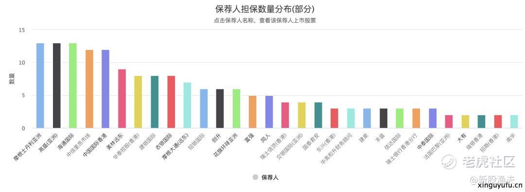 上市股票涉及多达64 个保荐人,下图由数量从多到少展示部分数据,点击保荐人名称,可以查看该保荐人下所有股票详情、涨跌幅等信息。