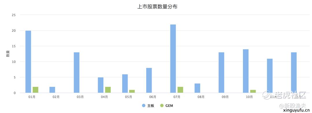 下图为上市股票月度分布图,统计每月上市股票数量。